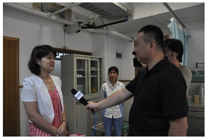 正在醫院進行采訪的中央電視臺記者獲知完達山為五胞胎家庭解決寶寶們三年的口糧,現場采訪了王榮霞。