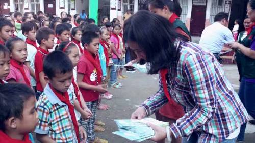 早晨7點鐘,愛心隊伍從南寧地王大廈出發,途中路況極差,塵土飛舞。車隊歷經九個小時到達泮水鄉村冊外小學。愛心團隊的到來,頓時令這個校園學生歡騰熱鬧起來,學生排好整齊的隊伍歡迎著愛心隊伍的到來。學生代表們給到場的每一位愛心人士戴上了感恩紅巾。