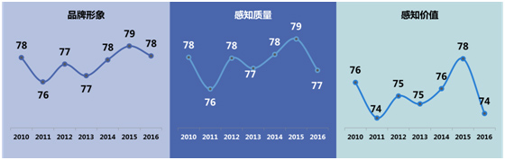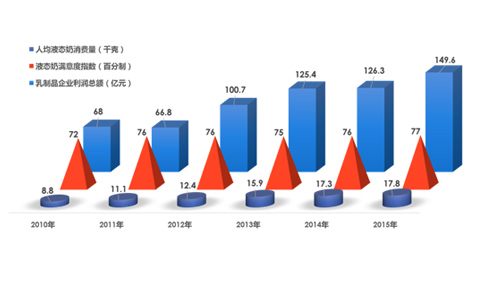 一、2016年液態奶行業滿意度得分76分(滿分100分),比2015年降低1分。品牌形象、感知質量和感知價值指數相比去年出現了不同程度的下降。從歷史數據上看,液態奶行業滿意度指數自2010年開始基本呈現調整上升的趨勢,與此同時,人均液態奶消費量和乳制品企業利潤總額均水漲船高。值得注意的是,2016年液態奶行業滿意度出現小幅下降,人均液態奶消費量的增速也在放緩,液態奶企業應重視影響消費者滿意度的因素并掌握未來液態奶的消費需求動向,以此作為未來營銷方向的重點。