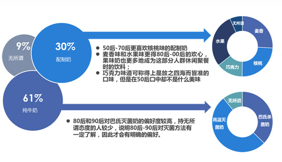 綜合年齡和區域分析發現,中老年消費者和70后消費者的需求區域主要集中于西部地區的中小城市;而對于80、90和00后的消費者,需求區域已經開始向東部地區的一、二線城市轉移,液態奶廠商需要隨時關注市場需求的動向來決定未來營銷、鋪貨的策略等。
