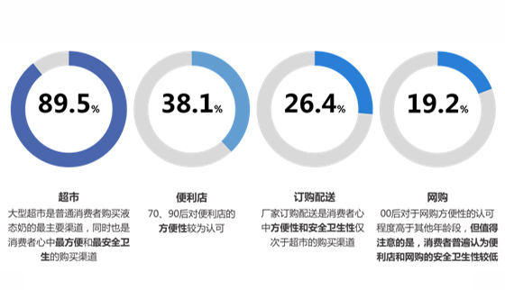 接近九成的消費者會選擇從超市購買液態奶,其次是便利店(38.1%)和訂購配送(26.4%),網購的比例更低,只有不到兩成。在消費者心中,超市也是“更方便”和“更安全衛生”的購買渠道,其次是廠家訂購配送的渠道,僅有18.2%和13.7%的被訪消費者認為便利店和網購是“更方便”和“更安全衛生”的購買渠道。