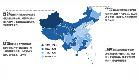 從地區上看,華北地區(除北京和天津兩個直轄市外)整體比例較低,西部地區比例很高,另外長江流域省份也相對較高。一線城市消費者對于液態奶健康方面的需求相對更加看重;二、三線城市以及其他中小城市則更加關注液態奶的味道、美容減肥效果、滿足小孩喜好等,且更易受身邊朋友的影響。