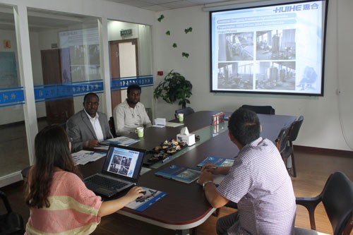 非洲吉布提客戶需要訂制全套牛奶生產線設備,來我公司參觀并與銷售人員進行具體細節的洽談。